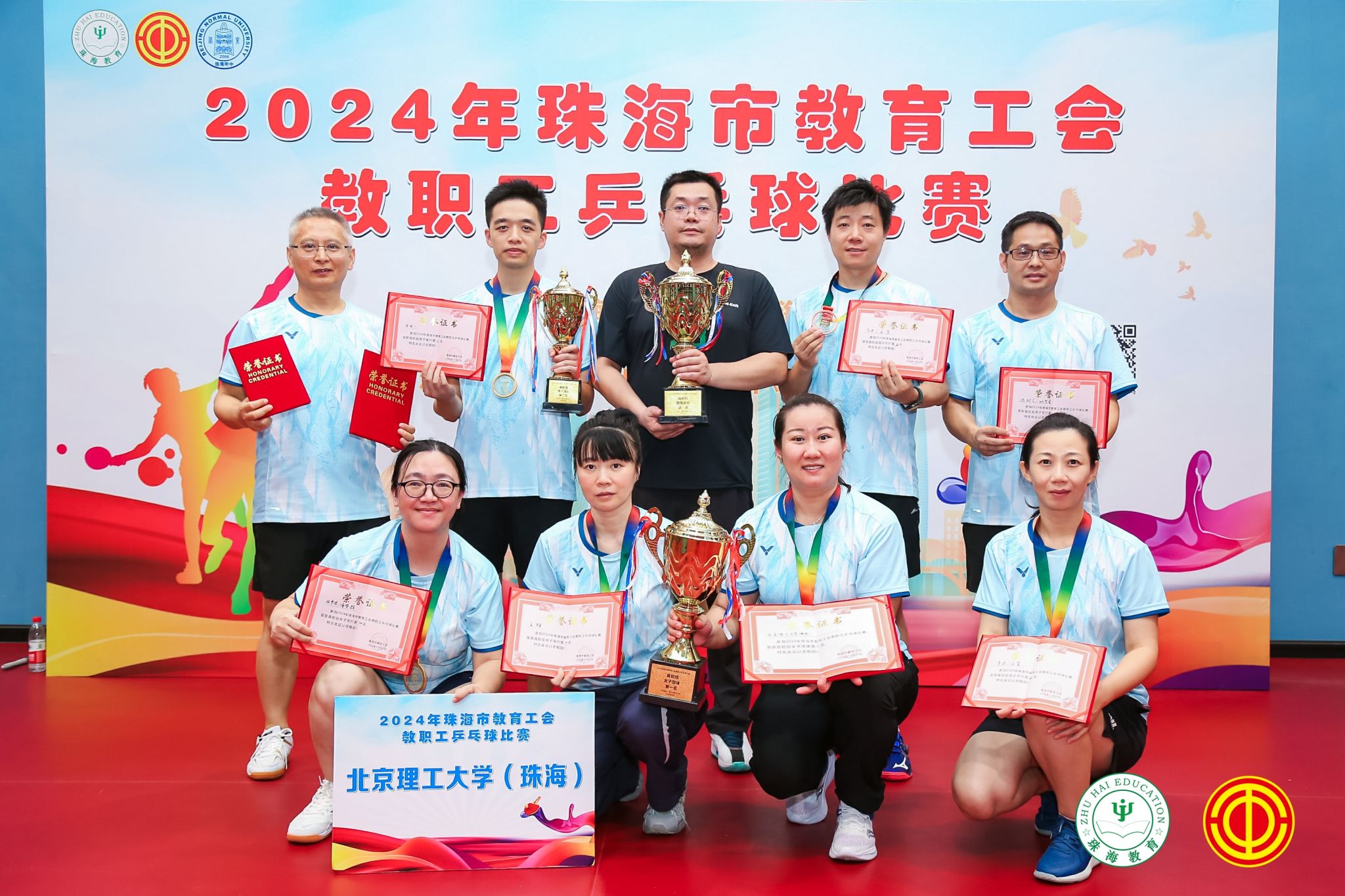 校工会作为2024年珠海市教育工会教职工乒乓球赛的牵头单位,在体育部的积极配合下,顺利完成了队员选拔、赛前训练和竞赛组织工作,取得了参加此项赛事以来的历史最好成绩。