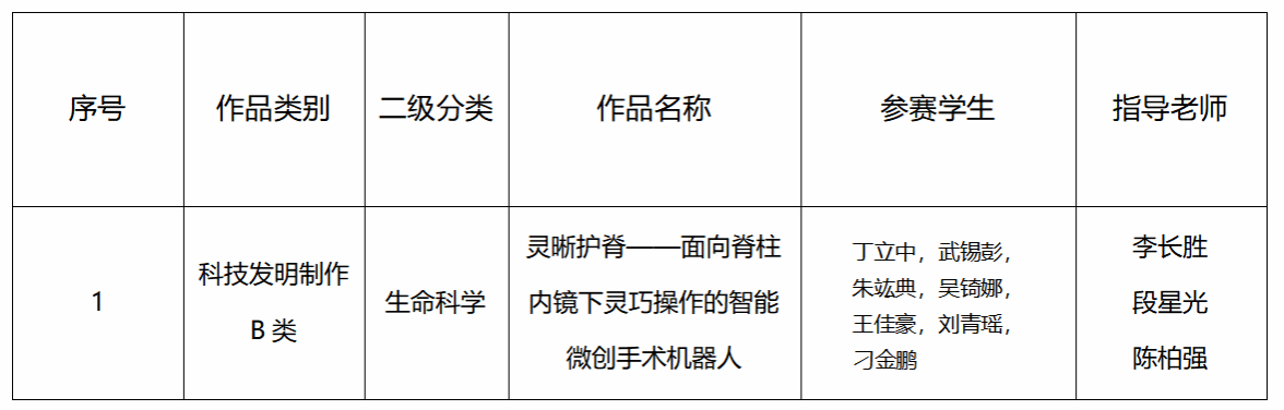 按照第十九届“挑战杯”全国大学生课外学术科技作品竞赛相关要求,根据广东省“挑战杯”终审决赛的评审结果,拟推荐省赛特等奖项目:灵晰护脊——面向脊柱内镜下灵巧操作的智能微创手术机器人,参加第十九届“挑战杯”全国大学生课外学术科技作品竞赛主体赛,具体公示如下: