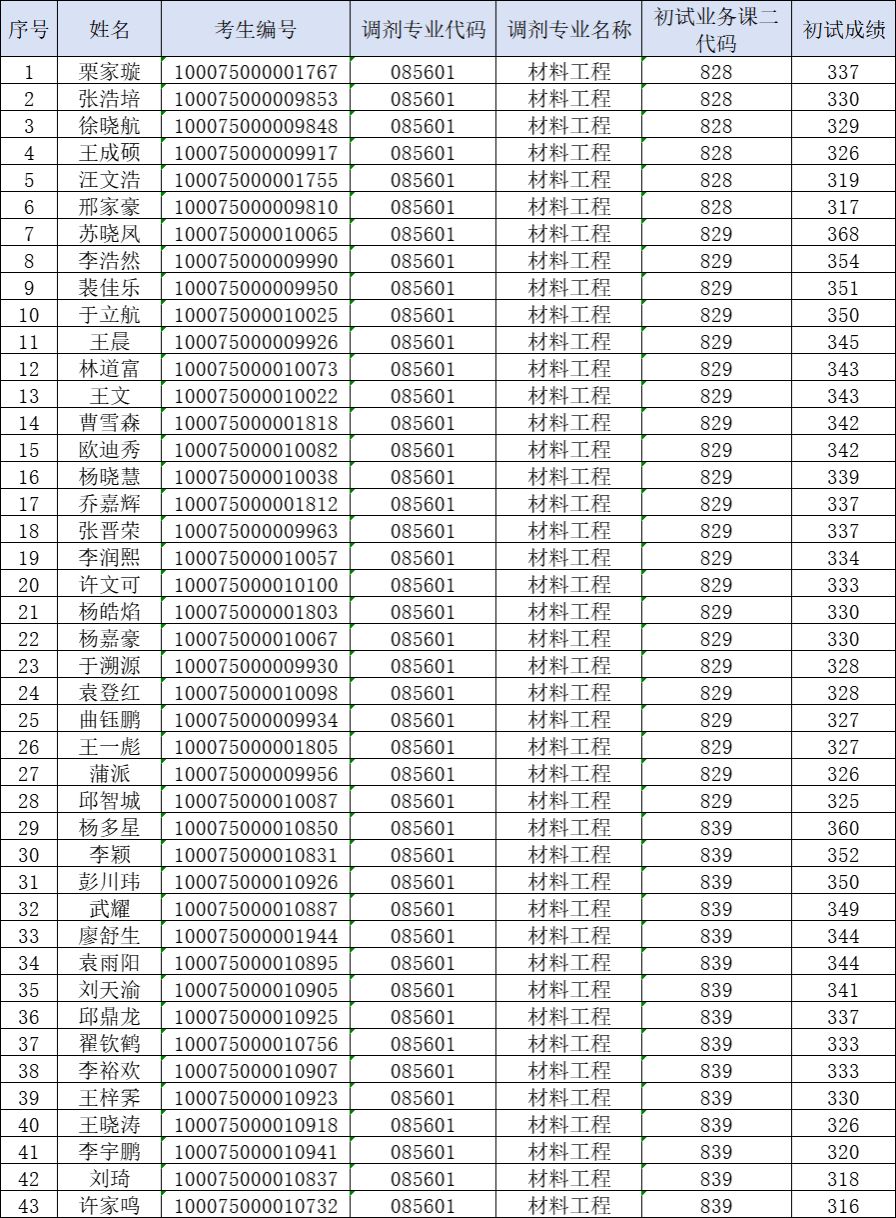因校区计划调整,现将085601材料工程专业计划调整为26名,以下考生进入复试名单: