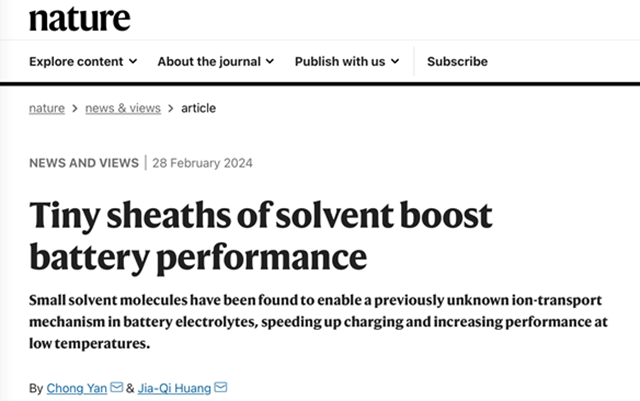 近日,《Nature》期刊邀请前沿交叉院闫崇副教授和黄佳琦教授在News&Views专栏发表《Tiny sheaths of solvent boost battery performance》(微型溶剂化结构提升电池性能)为题的评述,阐述新型溶剂化结构给锂电池快充和低温带来的新机会。
