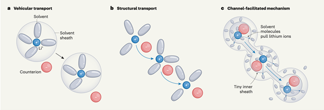 经典理论认为锂离子在电解液中存在两种主要传输机制。a 车辆运输,离子在移动时携带一层溶剂分子,较大的溶剂分子阻碍运输。b 结构传输,离子与一个或多个溶剂分子形成络合物,因此可以在分子之间跳跃。C 新发现非常小体积的溶剂分子能在在锂离子周围形成两个鞘层;内鞘层含有溶剂分子和阴离子,外鞘只含有溶剂分子,这些分子将锂离子从内鞘中拉出,从而产生锂离子快速通过的通道,大大增强了离子的迁移率。