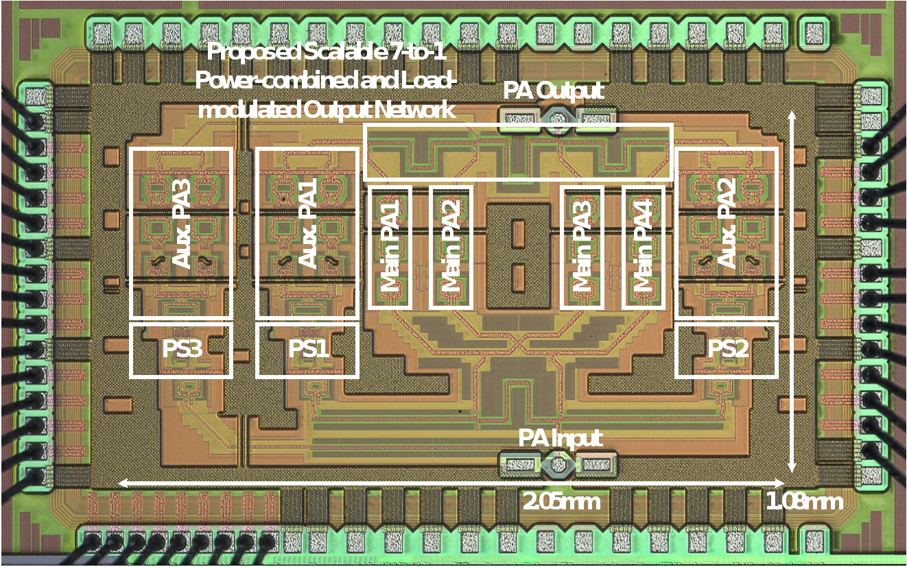 基于上述架构和电路层面的创新,团队研制了一款基于65nm CMOS工艺的7路负载调制平衡功率放大器芯片。测试结果表明,放大器的小信号增益可达18.4dB,在27.2-to-45GHz频带内都实现了较好的端口匹配。该放大器在26-40GHz的频率范围内都达到了大于25.4dBm的饱和功率和大于22%的峰值效率,并展示出卓越的功率回退效率提升和AM-PM线性度。在38GHz频点,放大器实现了17.1dB增益, 在峰值/6/9/12dB回退点效率分别为28.8%/23.2%/16.3%/11.9%。在当前国际上公开报道的工作在30GHz及以上的功率放大器中,该电路实现了最高的峰值效率和功率回退效率。芯片的调制测试结果则证明了该电路可广泛应用于宽带高速无线通信链路中。