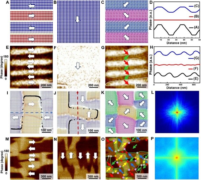 图3. 极化波叠加形成条纹畴和涡旋-非涡旋网络的相场模拟和实验观察。