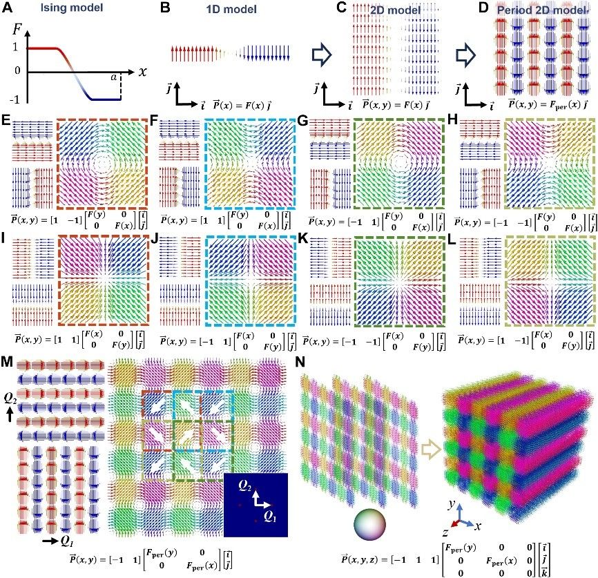 图2. 铁电涡旋单元和2D、3D涡旋-反涡旋阵列的极化波叠加。