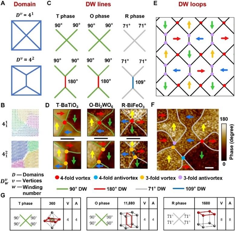 图1. 通过畴壁相交进行铁电材料中的涡旋观测和分类。