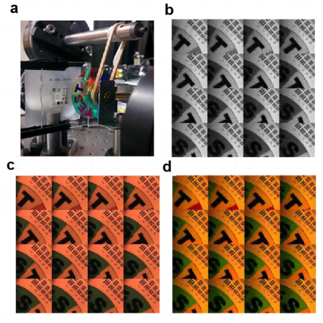 实验中重建视频空间大小为128 × 128,具有64个光谱频道,帧率约4帧/秒,压缩比约为900:1。图2展示从重建的高光谱频帧中均匀选取16帧并转换为人工RGB图像,与彩色相机记录的画面对比,可见实现了高精度的重建。