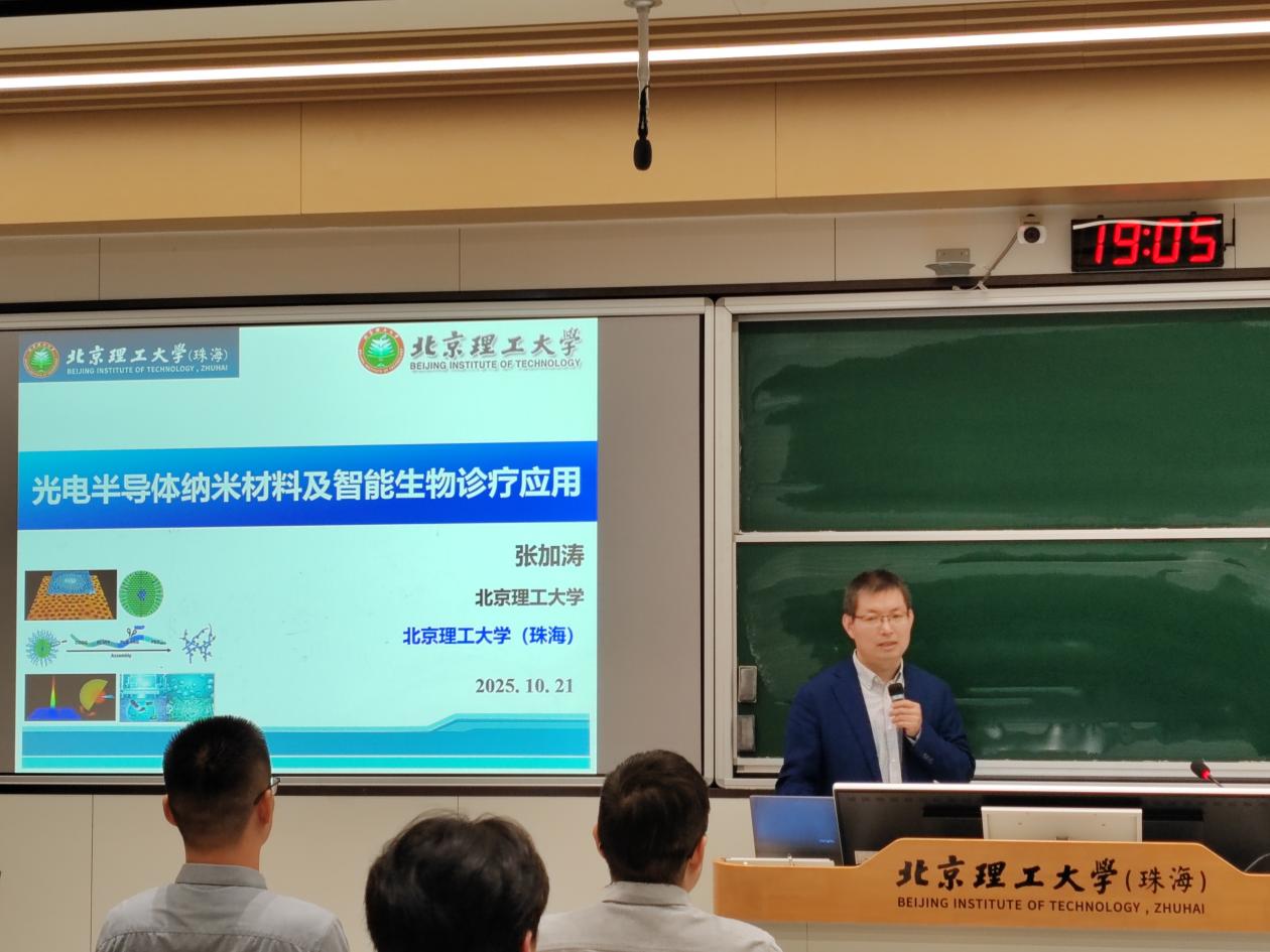 为推动学科交叉与融合创新,营造浓厚的学术氛围,10月21日晚,前沿交叉学域主办的系列学术讲座第一讲在弘毅楼HF204正式拉开帷幕,特邀北京理工大学化学与化工学院院长张加涛作题为《光电半导体纳米材料及智能生物诊疗应用》的专题讲座,为现场师生带来一场前沿学术盛宴。