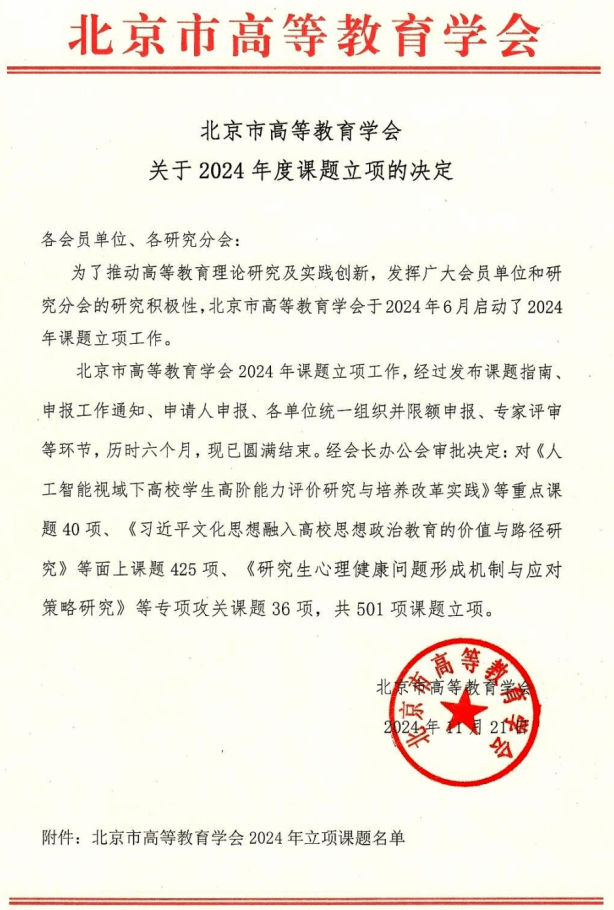 张加涛带领的“纳米生物医药与诊疗研究”团队申报的“面向材料类专业硕士的产教融合项目制PBL课程建设”项目,成功获得北京市高等教育学会2024年面上课题立项