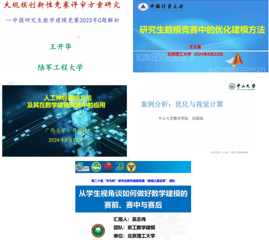 在7-8月的暑期培训期间,围绕往年竞赛试题分析和备赛经验分享等培训内容,陆续邀请了陆军工程大学王开华教授、中国计量大学王义康教授、广西大学吕跃进教授、中山大学冯国灿教授,分别从建模命题、优化建模方法、神经网络方法及其在数学建模中的应用、视觉计算与优化等方面为同学们进行了深入浅出的线上讲授。