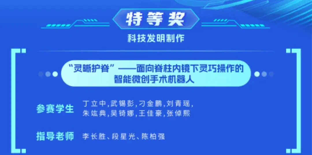 其中,特等奖的项目团队立足医工融合领域,面向临床实际需求,创新性地融合机器人技术与人工智能算法,成功开发出具有高精准度和灵活操作性能的智能手术机器人。该团队不仅为脊柱内镜微创手术提供了革命性的解决方案,更计划在粤港澳大湾区孵化专精特新“小巨人”企业,推动科研成果产业化落地,为珠海校区医工融合高质量发展注入新动能。本届参赛成绩体现了珠海校区研究生培养在创新实践教育体系方面取得的阶段成果,生动展现了珠海校区在科技创新领域的强劲实力与蓬勃活力,彰显了新时代青年科技人才的创新担当。