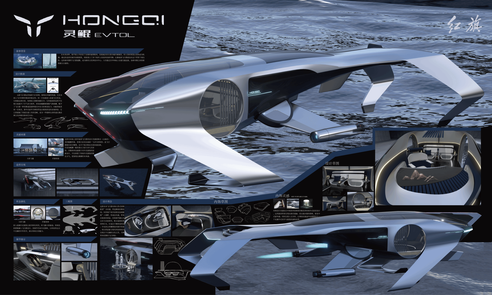 获奖作品“灵鲲 ---EVTOL”以未来海洋都市生活圈为背景,巧妙地融合科技、人文与美学,探索出全新的出行方式,设计灵感源于中国神话中的“鲲鹏”,象征着超越现实的自由与力量,通过地效飞行模式,突破传统交通工具的限制。内饰设计则汲取中式园林的“框景”艺术,营造出宁静雅致的乘坐空间,展现了东方美学的独特魅力,以其前瞻性的设计思维和卓越的创新精神,赢得了评委会的高度赞赏。