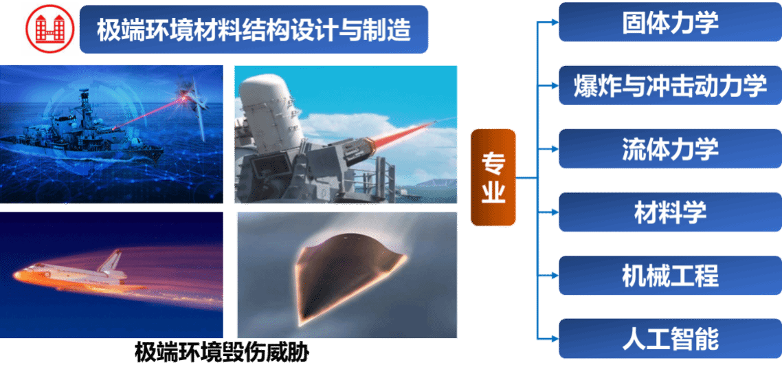 针对装备面临的极端环境威胁(如冲击、电磁、激光、强微波、高温、低温等),攻克力-热-磁-化学多场耦合材料响应机理、人工智能多尺度设计、动态多场信息原位测量原理等基础性科学问题,突破极端环境下的新材料、新结构、新器件的设计、先进制造与表征评价技术。团队承担多项国家重点研发计划。