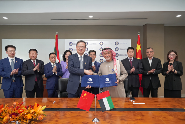 在迪拜大学,张军一行受到校长巴斯塔基(Dr. Eesa Mohammed Al Al Bastaki)等校方人员的热烈欢迎。双方在国际人才培养、前沿科技探索等方面达成合作共识。在中国驻迪拜总领事李旭航的见证下,张军与巴斯塔基签署了校际合作备忘录。
