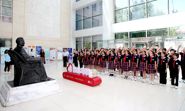 这是发生在北理工良乡校区徐特立图书馆大厅中感人的一幕,来自河北省石家庄市井陉矿区第一小学的同学们用队礼表达对人民教育家、北理工老院长徐特立先生的崇高敬意。