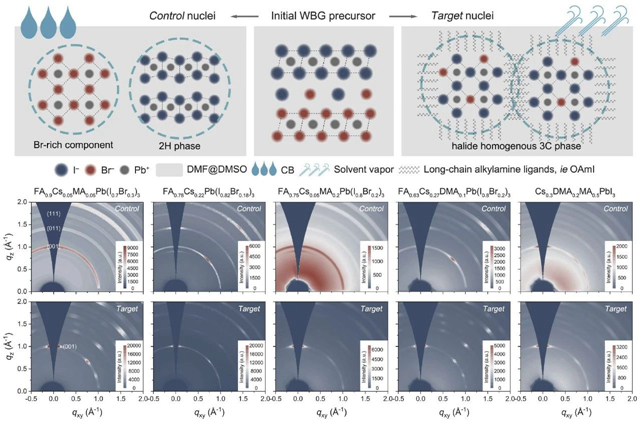 改善宽带隙钙钛矿的晶体质量和织构特性需要对其结晶生长过程进行精准的控制。然而这类材料组分复杂,以不同的晶核为起点的结晶途径会相互竞争,最终导致薄膜存在多种相态且组分分布不均一,产生大量缺陷。针对这一问题,团队提出了一种简单普适的晶核工程策略,通过在前驱液中简单地添加长链烷基胺,如油胺碘,形成具有均匀组分分布的单一3C相优势晶核,大幅抑制了其他非理想晶核的产生。同时结合真空抽气薄膜沉积技术,减少晶核生长过程中局部环境的影响,从而制备出高结晶性且晶面取向高度集中的高质量宽带隙钙钛矿薄膜。