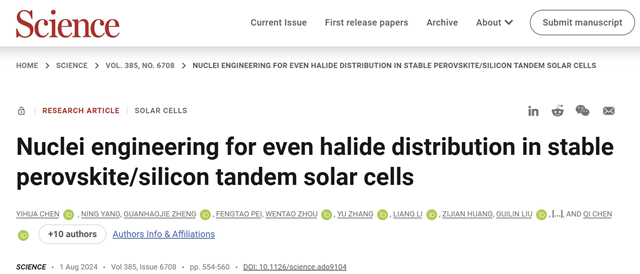 文章题为“Nuclei engineering for even halide distribution in stable perovskite/silicon tandem solar cells”,提出了一种简单普适的宽带隙钙钛矿结晶控制策略——晶核工程。该策略通过调控前驱液中优势晶核,优化了宽带隙钙钛矿薄膜的织构,提升了薄膜质量,由此显著提高了钙钛矿/晶硅叠层太阳能电池的效率与长期运行稳定性。