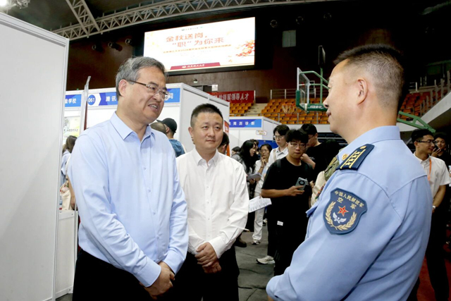 在大型招聘会现场,张军与空军部队有关单位、中国五洲工程设计集团、腾讯、字节跳动、中国卫通集团等用人单位进行了交流,介绍了学校高质量发展情况和促进毕业生高质量充分就业举措,了解了用人单位招聘需求,希望进一步深化双方在毕业生就业、人才培养、科学研究等领域的精准对接、合作共赢。张军还亲切询问了现场毕业生的求职意向和应聘情况,鼓励同学们传承延安根、铸牢军工魂、争做领军人,把个人职业理想融入强国建设,到祖国需要的地方建功立业,为实现以中国式现代化全面推进强国建设、民族复兴伟业贡献青春力量。张军一行还来到学校AI智能简历“诊断室”、求职能力“加油站”、生涯规划“导航台”等提供现场就业指导的展位,了解学校将人工智能技术与职业生涯教育深度融合、赋能毕业生求职竞争力的工作情况。