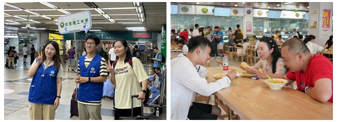 迎新期间,学校在北京站、北京南站、北京西站、北京朝阳站和北京丰台站等主要车站设有迎新接站及校车服务,在校内设托运行李领取处并安排摆渡车在宿舍和各个服务点之间往返,帮助新生运送行李。迎新现场,高年级学生志愿者为新生提供咨询引导等暖心服务,安全、温馨、细致、有序,处处洋溢着欢迎新同学的热情。食堂全天候开放,为新生及家长提供迎新套餐。同时学校采用智能化迎新模式——“刷脸”报到,简化报到流程,提高服务效率。