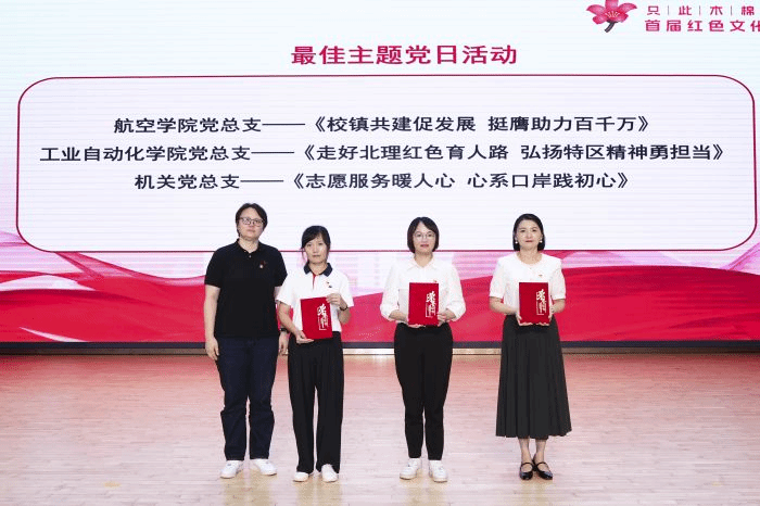 罗勇、丁璇、张恩分别为本届红色文化节评选出的十佳党员先锋岗、最佳主题党日活动及微党课比赛获奖师生及团队颁奖。